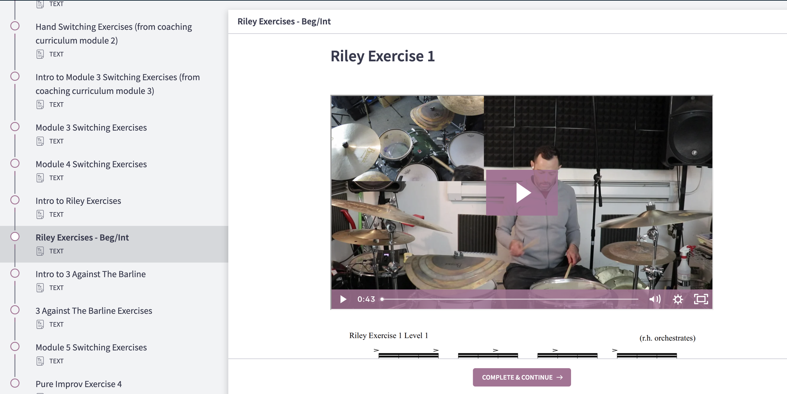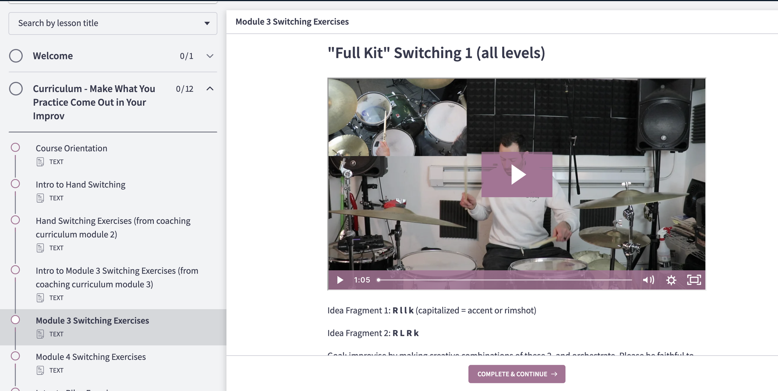 It’s from the “Riley Exercises” Mini-Module, and introduces the concept of using “claves”, like those from John Riley’s book, as “resolution points” for improv ideas, then filling in the sticking around them.